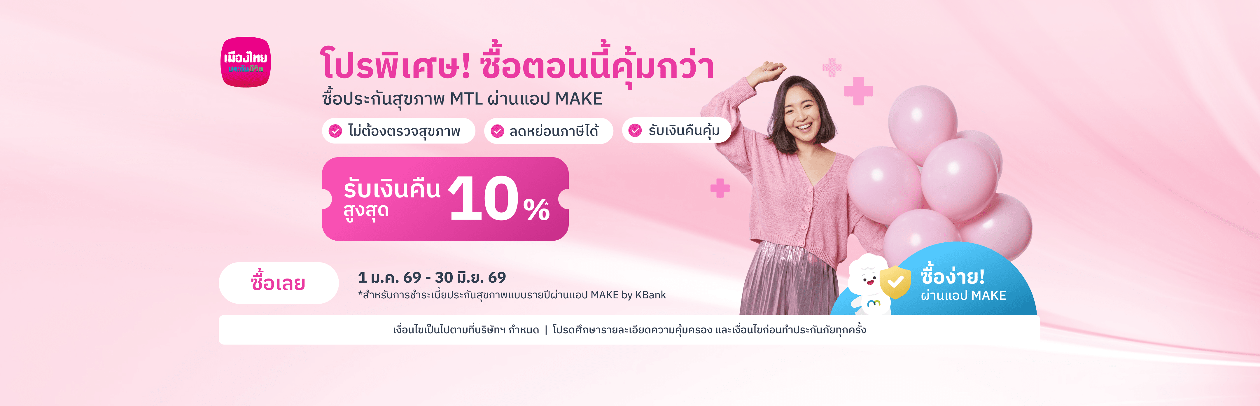 ซื้อประกันสุขภาพบนแอป MAKE รับเงินคืนสูงสุด 10%*สมัครง่าย คุ้มครองครอบคลุม ลดหย่อนภาษีได้31 ธ.ค. 68 - 31 ธ.ค. 69