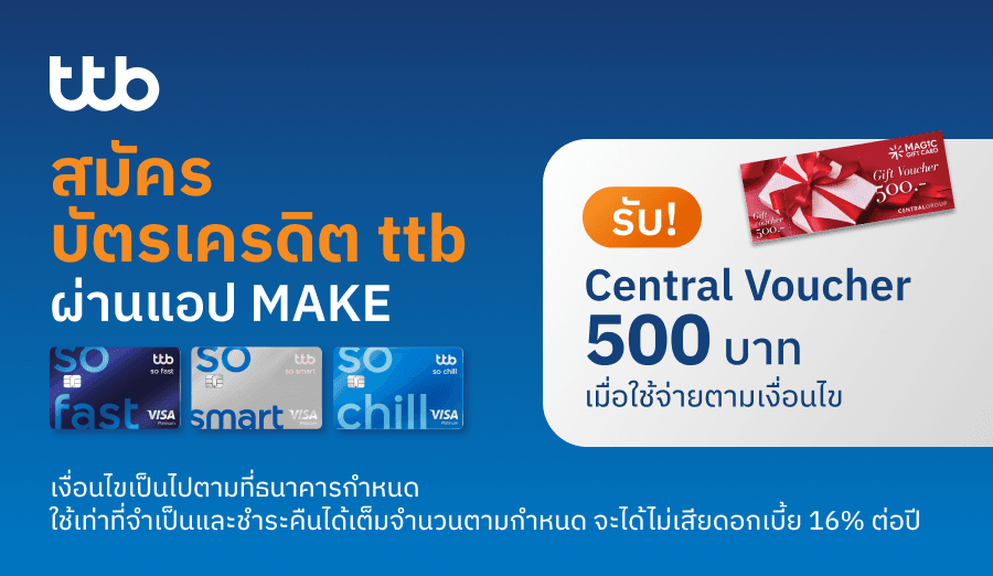 สมัครบัตรเครดิต ttb ผ่าน MAKE รับ Central Voucher 500 บาท*พิเศษเฉพาะลูกค้า MAKE เท่านั้น!17 มี.ค. 69 - 30 เม.ย. 69